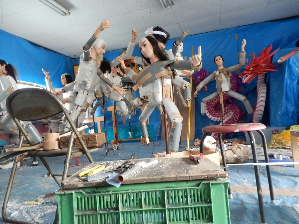 消防団の屯所2階でも人形作りや発泡造形などの作業をされています。